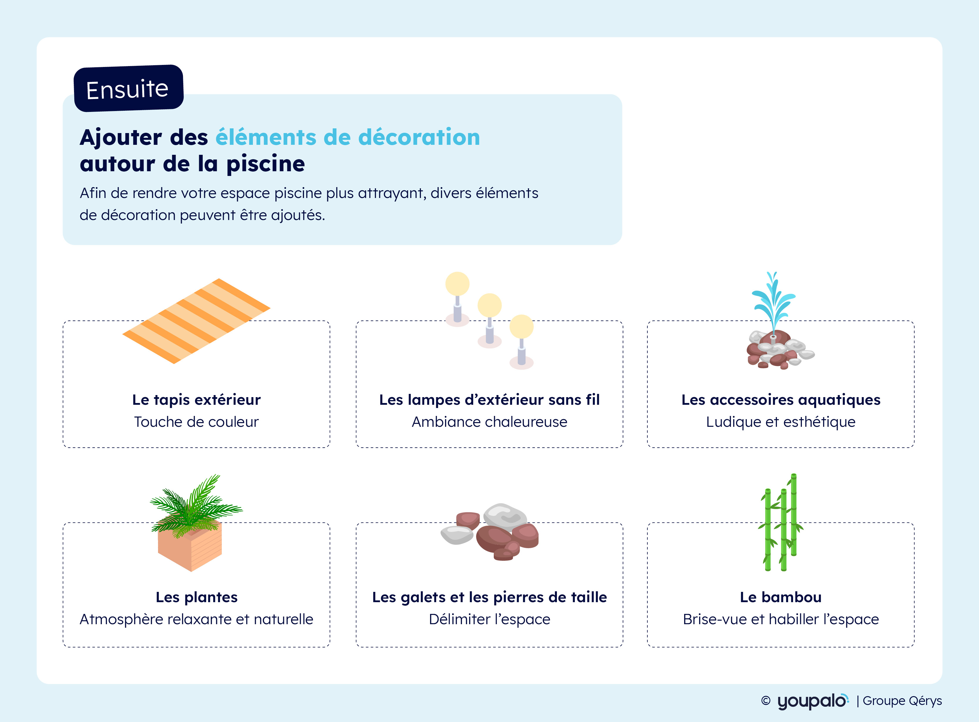Afin de rendre votre espace piscine plus attrayant, divers éléments de décoration peuvent être ajoutés.