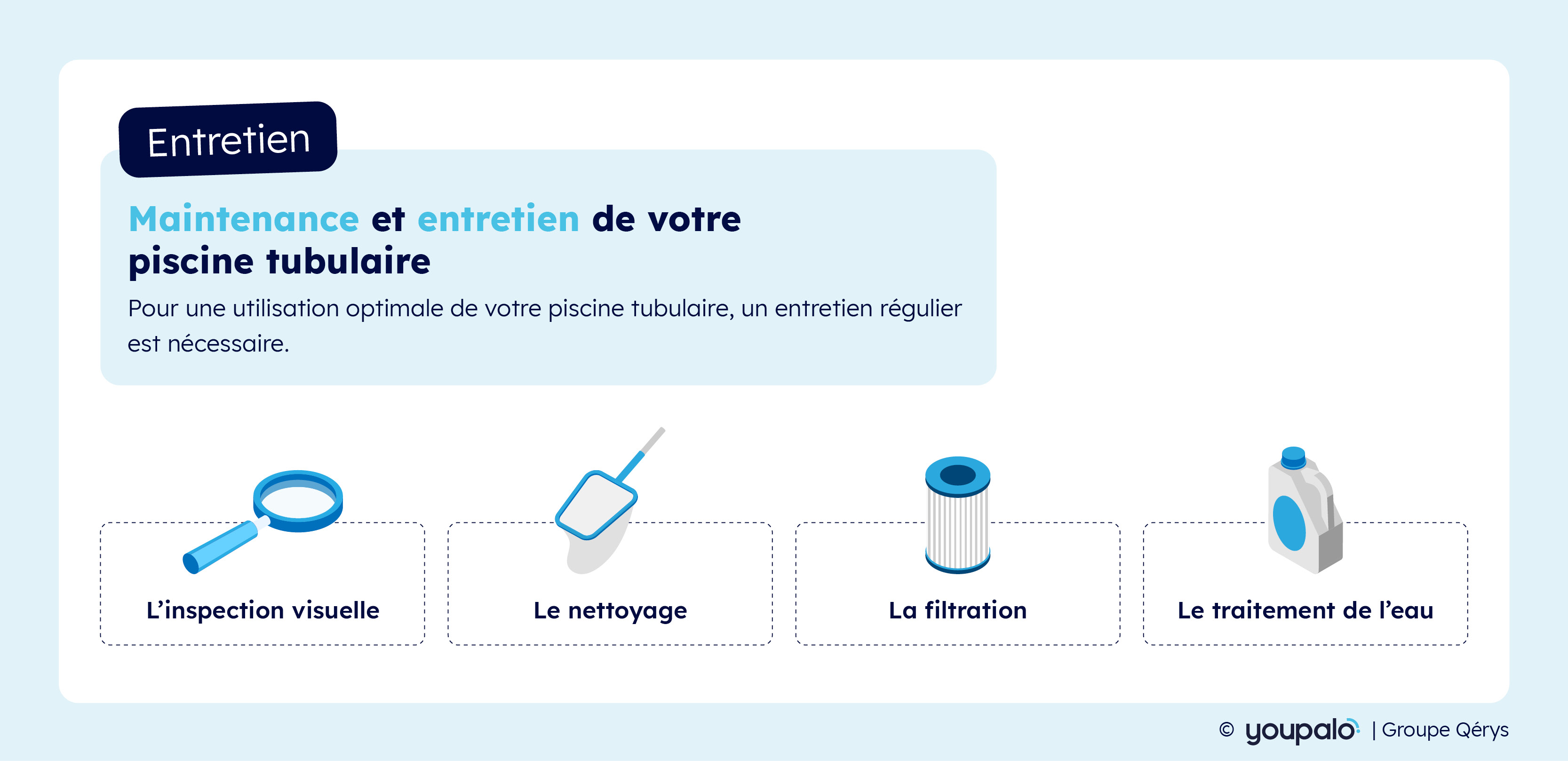 Pour une utilisation optimale de votre piscine tubulaire, un entretien régulier est nécessaire. L'inspection de la structure, du filtre et du skimmer permet de garantir une eau propre et une piscine en bon état.