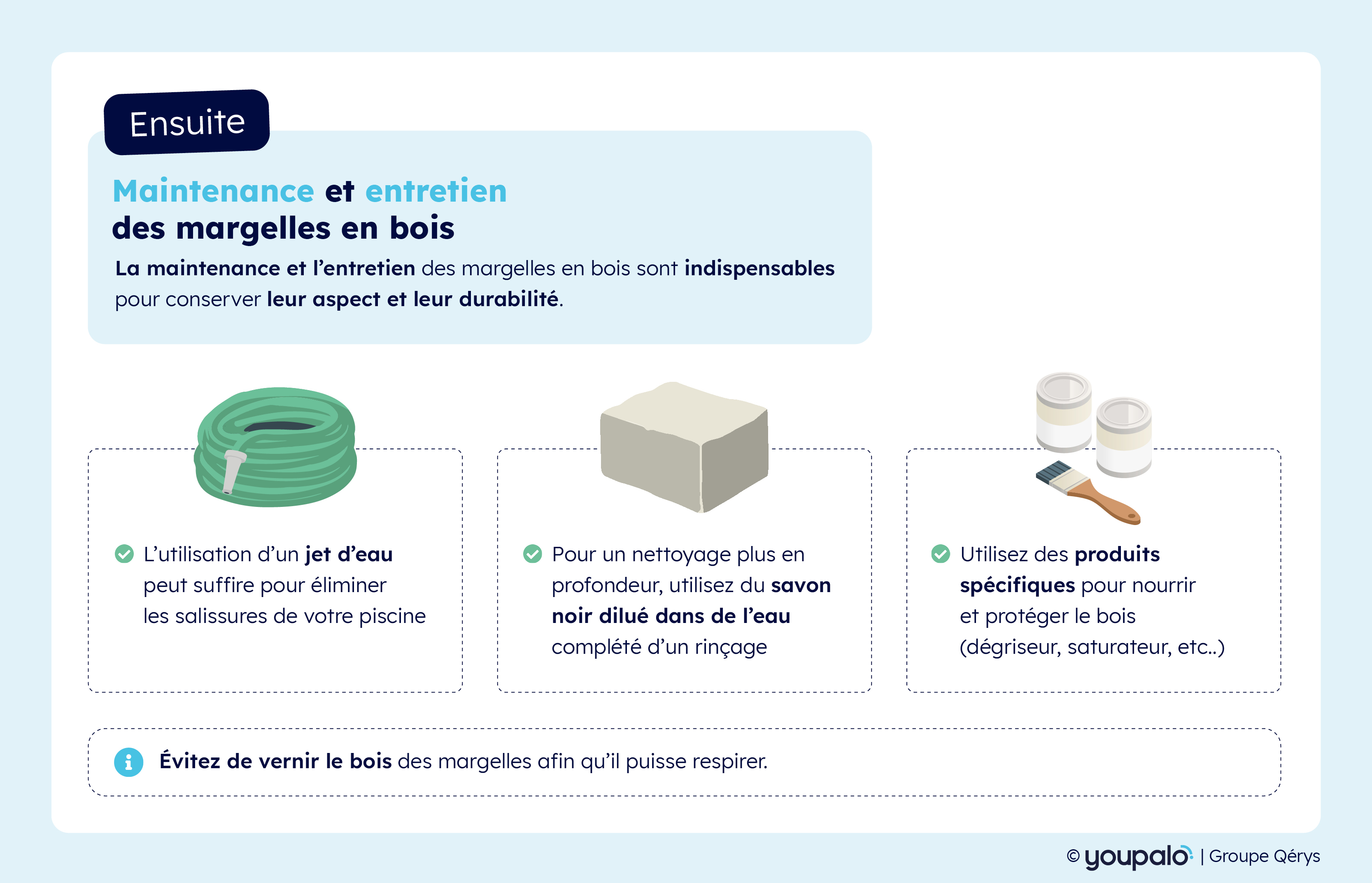 Notez que les margelles en bois doivent être de qualité et traitées contre les UV et l'eau pour garantir leur durabilité.