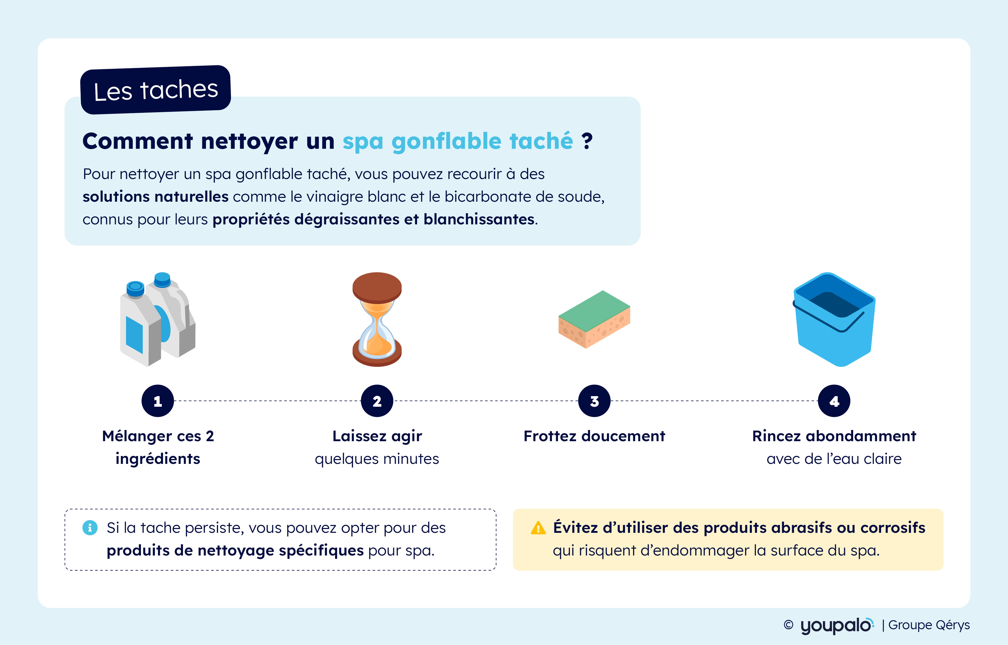 Si la tache persiste, vous pouvez opter pour des produits de nettoyage spécifiques pour spa, conçus pour être doux sur le PVC ou le vinyle. Appliquez le produit sur la tache, frottez délicatement avec une éponge, puis rincez.